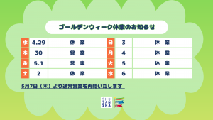 誠に勝手ながら、弊社のゴールデンウィークの休業期間につきまして、下記の通りご案内させていただきます。